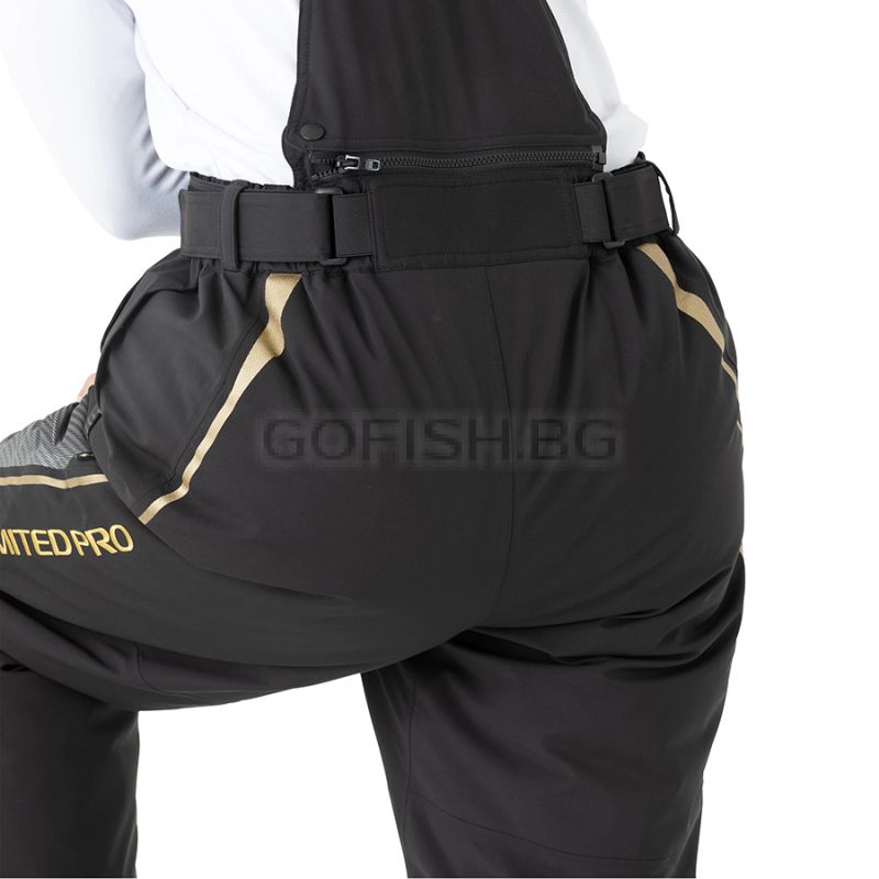 Pants with adjustable straps, reinforced part of the waist and back and a double cuff on the leg to prevent water from entering the shoe and boot.